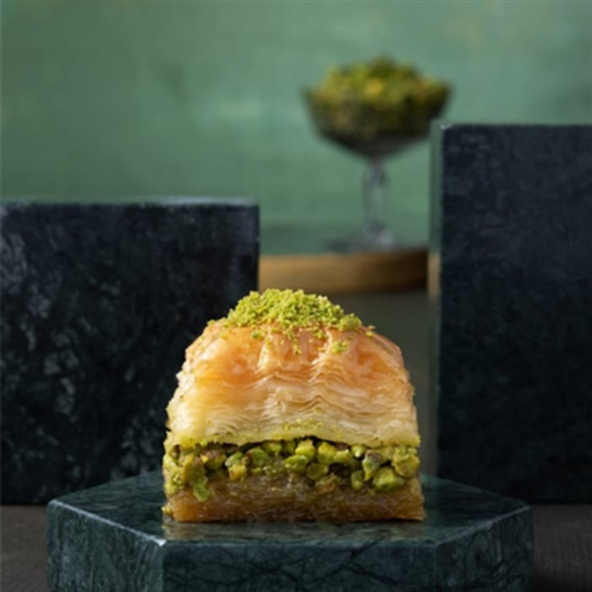 Square baklava with crunchy pistachios in a special box from Karakoy Gulluoglu.