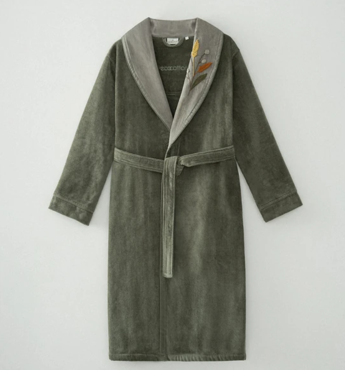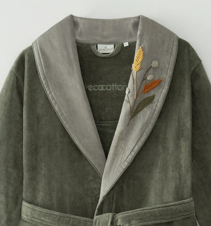 ارتقي بلحظات الاسترخاء اليومية مع روب الحمام "فرح"، المصنوع من قطن إيجه العضوي 100% والمعتمد عالمياً. يتميز بقماش مخملي فاخر يحيط بالجسم بملمس ناعم ودافئ، ويمنحك توازناً مثالياً بين الخفة والامتصاص العالي. تصميمه المميز يتجلى في الياقة الشال، وخياطة دقيقة، وتفاصيل أنيقة مثل التطريز اليدوي والبييه القطني.