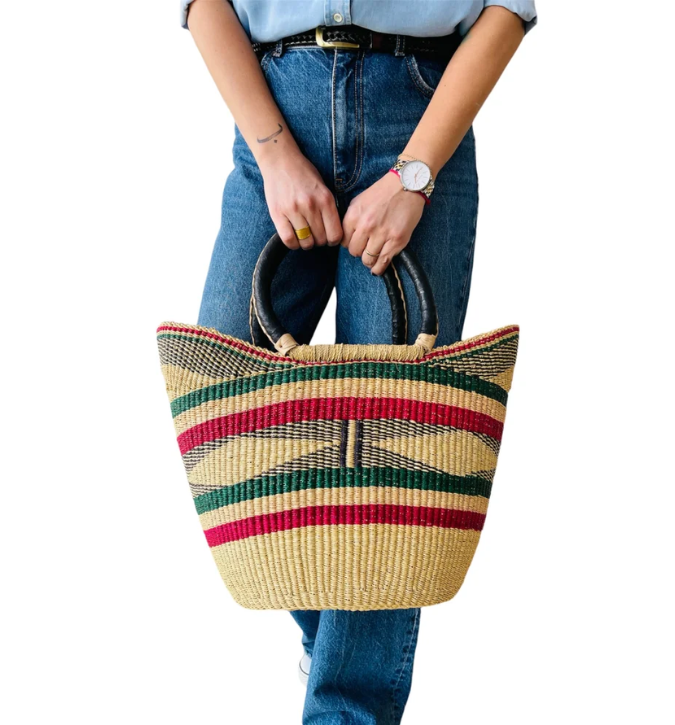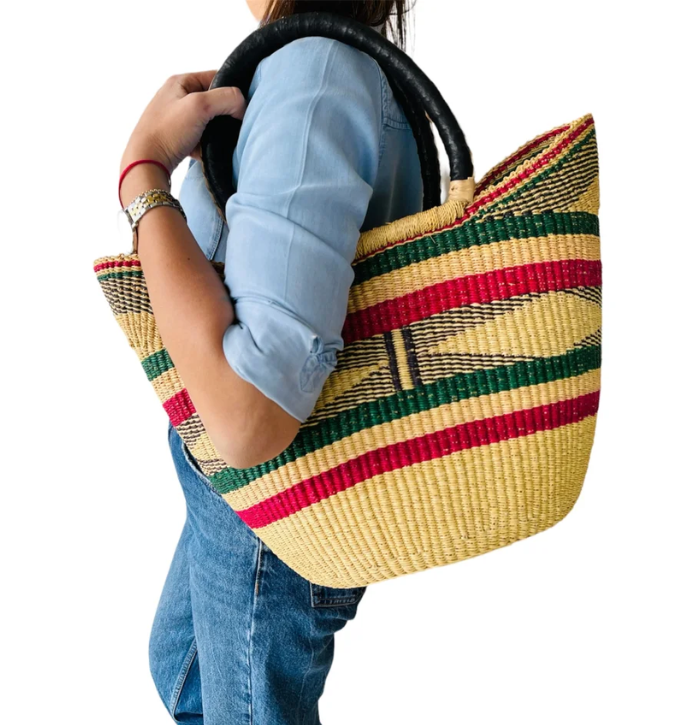 اختاري لمسة فريدة من الثقافة والأناقة مع شنطة الشاطئ اليدويّة المصنوعة من الأعشاب الطبيعية في شمال غانا. تتميز هذه القطعة بحياكة تقليدية دقيقة باستخدام ألياف نباتية مصبوغة طبيعياً، ما يجعل كل شنطة فريدة من نوعها.