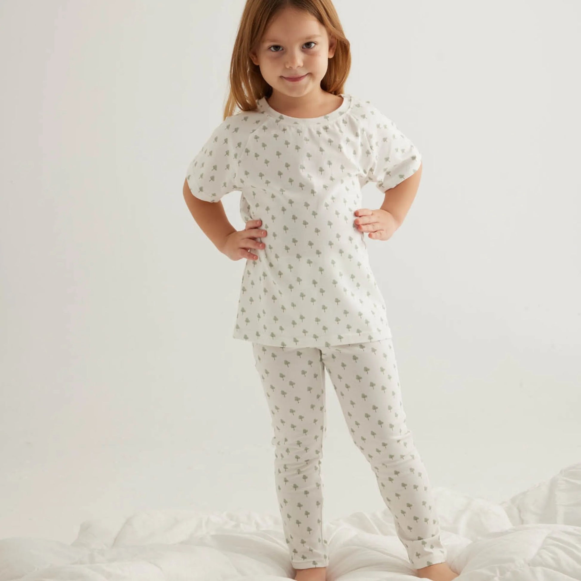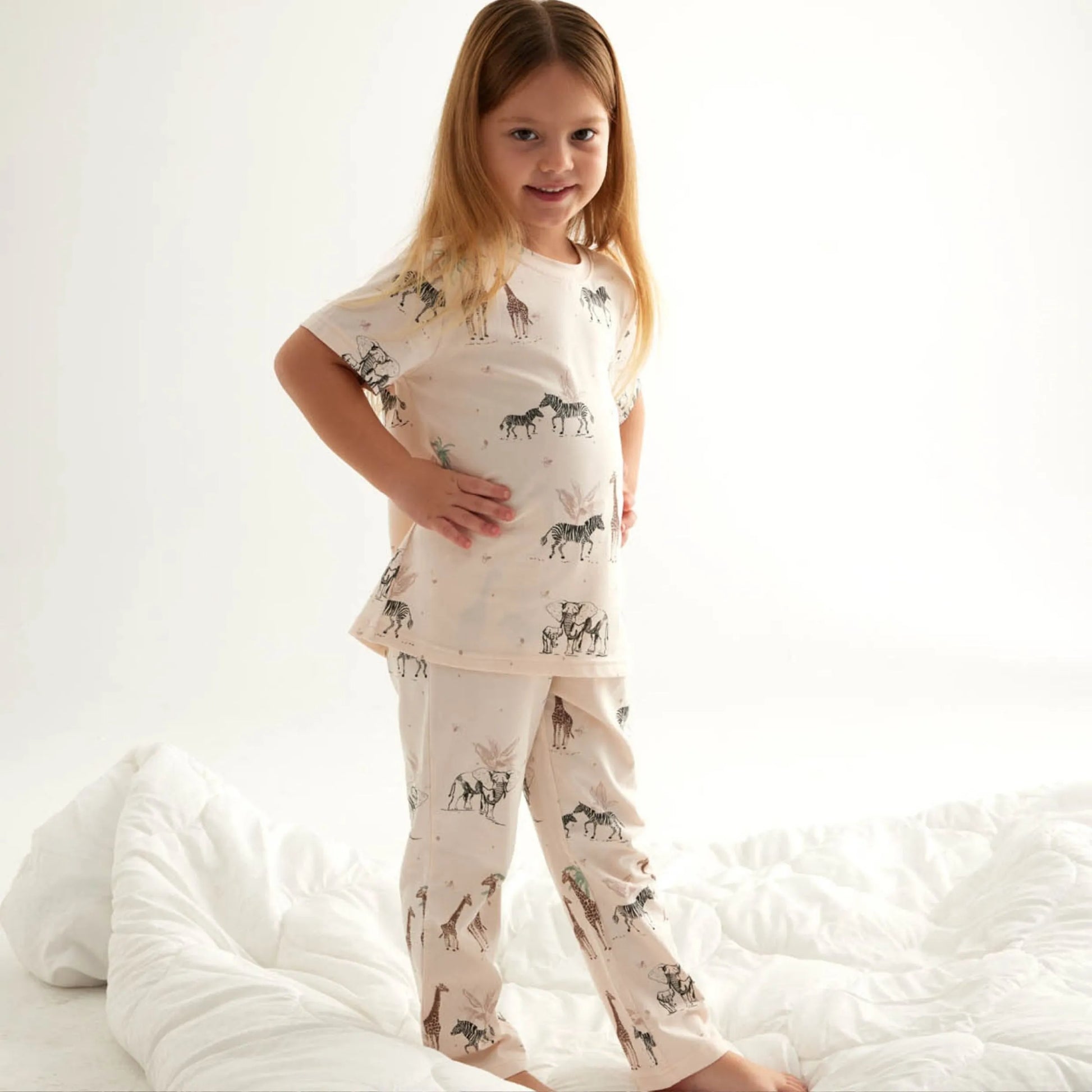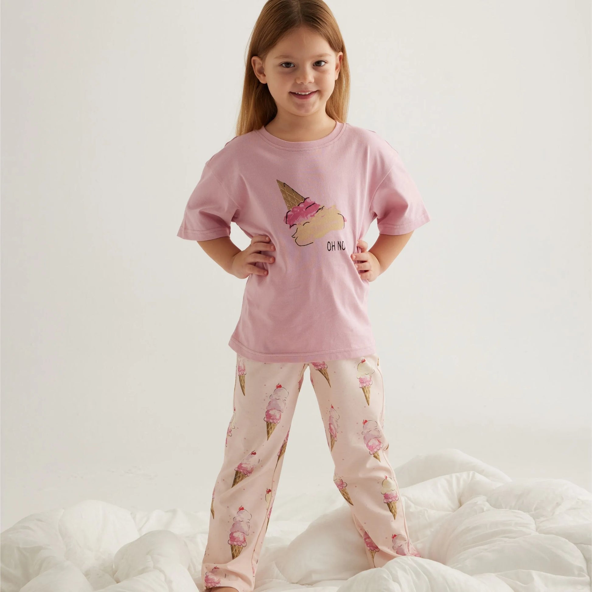 بيجاما بناتية لطيفة ومريحة مؤلفة من قطعتين: تيشيرت بأكمام قصيرة وياقة دائرية، مع بنطال طويل بطبعات مميزة. مصنوعة من قطن ناعم ومطاطي يضمن الراحة والمرونة أثناء النوم أو اللعب.