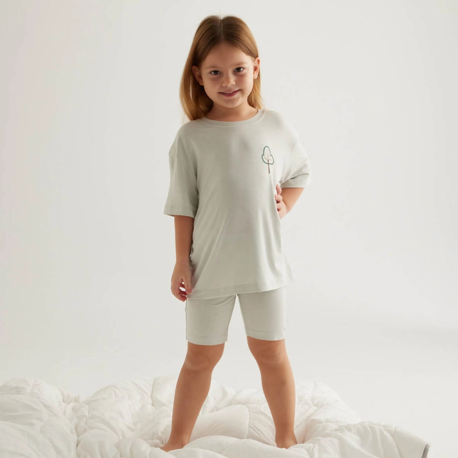 طقم بيجاما بناتي مكوّن من قطعتين. تيشيرت بياقة دائرية وأكمام قصيرة مع طبعة على الجهة الأمامية، يأتي مع ليغينغ قصير بخصر مطاطي لراحة أكبر. خامة فيسكوز ناعمة ومريحة، مثالية لأيام الصيف.