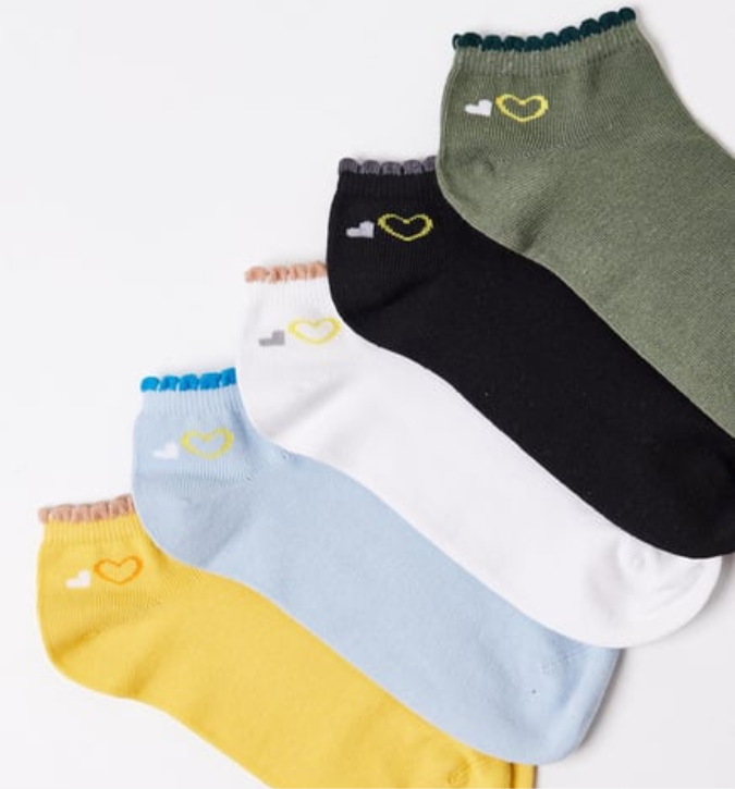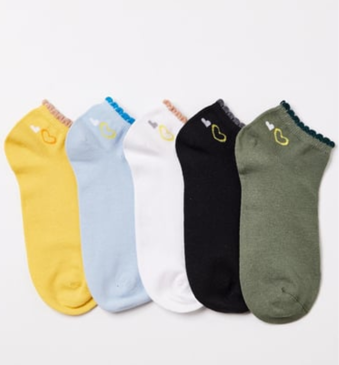 أضيفي لمسة من اللطافة والراحة لإطلالتك اليومية مع طقم الجوارب النسائية المكوّن من 5 أزواج بألوان مبهجة وتصميم قلب صغير على الجوانب.