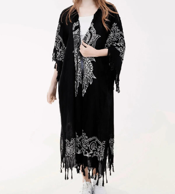 عباية نسائية باللون الأسود مطبوعة يدويًا مع حزام - أوناي تكس