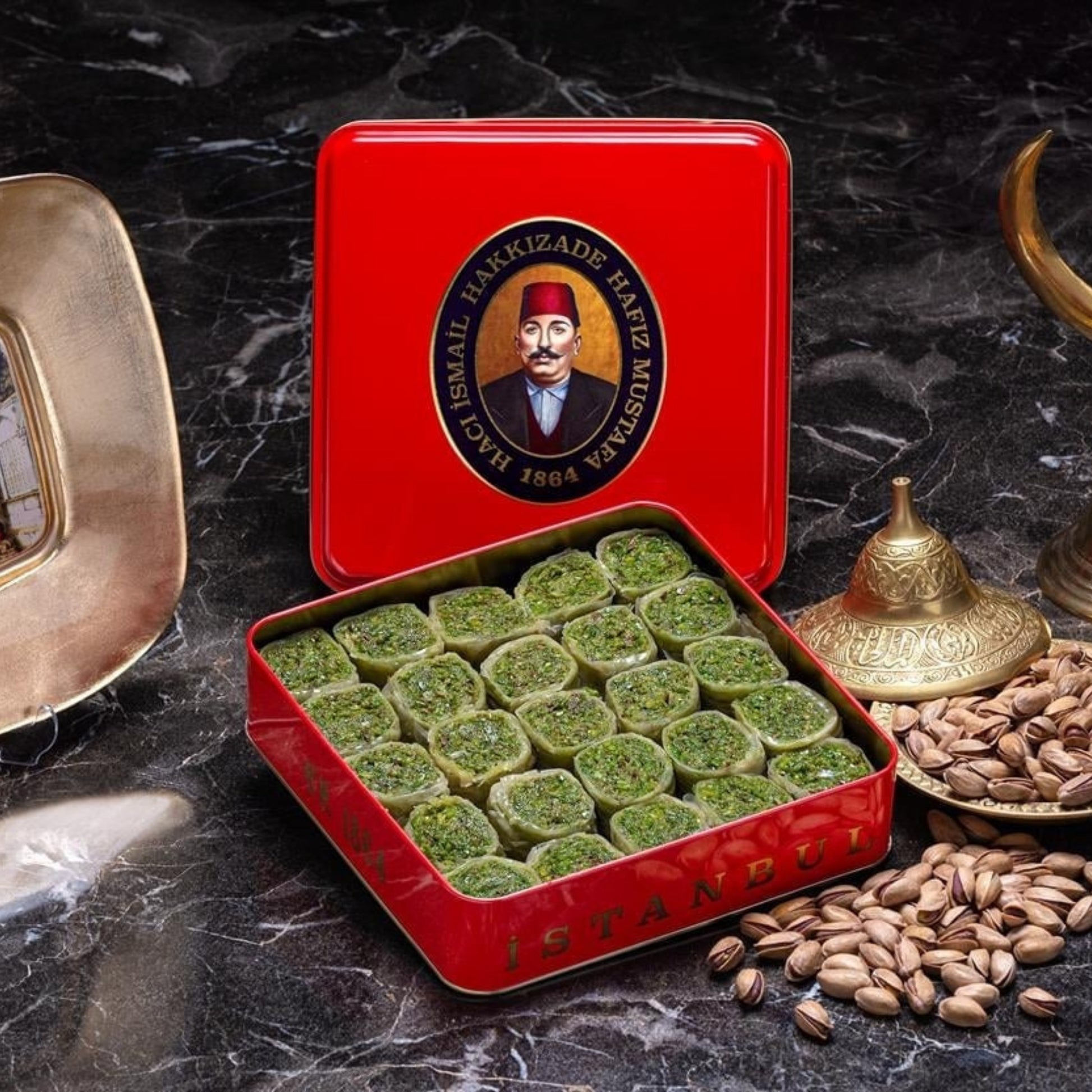 تذوّق الفخامة مع بقلاوة قصر إسطنبول المحشوة بالفستق من حافظ مصطفى – تجربة فريدة من نوعها تجمع بين الطبقات الذهبية المقرمشة وحشوة الفستق الأخضر الغنية.